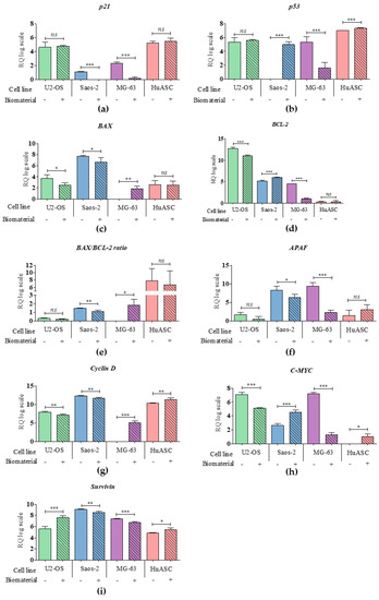 The cytotoxicity of PLLA/ Eu3+: nHAp biomaterial was also evaluated based on mRNA profile of genes involved in apoptosis and cell cycle (Figure 5 and Figure 6). Obtained results indicated that mRNA level for anti-apoptotic gene P21 was decreased in Saos-2 and MG-63. Moreover, the expression of P53 was increased in Saos-2 and HuASC, but decreased in MG‑63 line. The transcript level of APAF was significantly decreased in Saos-2 and MG‑63. Additionally, we observed that key pro-apoptotic gene BAX was increased in MG-63, but decreased in U-2 OS and Saos-2. In turn, the mRNA level of anti-apoptotic BCL-2 was decreased in U-2 OS and MG-63, but increased in Saos-2. The mRNA levels of Cyclin D, C‑MYC and Survivin, which are determinants of proliferation, were significantly increased in the HuASC line. However, in U-2 OS and Saos-2 cell lines the levels of Cyclin D transcripts were decreased, while in MG-63 it was increased. The C-MYC was decreased in U-2 OS and MG‑63, but increased in Saos-2. The Survivin was significantly decreased in Saos-2 and MG‑63, but increased in U-2 OS.