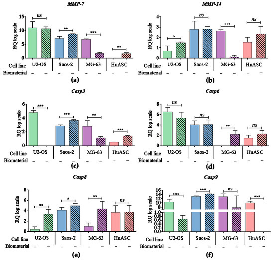 The mRNA levels of metalloproteinase 7 (MMP-7) and metalloproteinase 14 (MMP-14) were seen to be lower in MG-63 as a result of their propagation on biomaterial. However, the MMP-7 was increased in Saos-2 and HuASC. The MMP-14 was also increased in U-2 OS. The biomaterial caused an effect on the expression of caspases. The transcript level of Casp3 was increased in Saos-2 and HuASC, but decreased in U-2 OS and MG-63. The mRNA level of Casp6 was only significantly increased in MG-63. Except the HuASCs, all tumor cell lines had increased level of Casp8. Although, the mRNA level of Casp9 was increased in Saos-2, it was also decreased in U-2 OS and HuASCs.