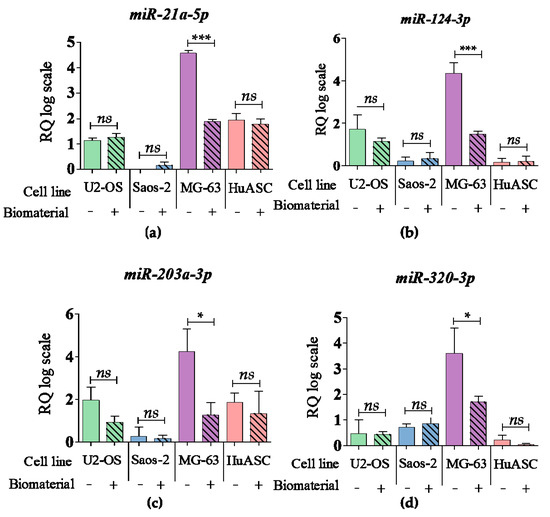 Examined biomaterial showed slight impact on the miRNA levels. During propagation onto biomaterial surface, only in MG-63 tumor cell line the levels of miR-21a-5p, miR-124-3p, miR-203a-3p, miR-320-3p were significantly decreased. No significant changes in miR profile were observed in the other cell lines (Figure 7).