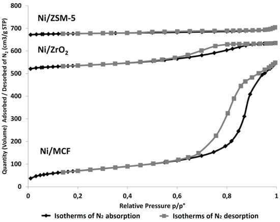 Porosity characterization of the catalysts revealed that N2 adsorption/desorption isotherms obtained for Ni/MCF and Ni/ZrO2 samples (Figure 1) are very close to type IV (as defined by International Union of Pure and Applied Chemistry—IUPAC). In the case of Ni/MCF catalyst, a hysteresis loop related to type H1 is observed. This suggests that this material possesses mainly mesopores which shape is cylindrical with a constant cross-section. Ni/ZrO2 is characterized by H2 type of hysteresis loop implying the presence of mesopores with spherical shape, open ends, and numerous narrowings. On the other hand, the adsorption-desorption isotherm of Ni/ZSM-5 catalyst can be classified to type I with a hysteresis loop of type H4, characteristic for micropores in the shape of narrow slits [31].