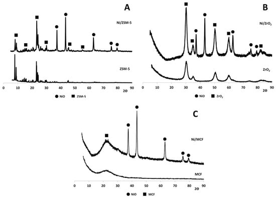 X-ray diffraction (XRD) diffractograms of: (A) ZSM-5 and Ni/ZSM-5, (B) ZrO2 and Ni/ZrO2, and (C) MCF and Ni/MCF.