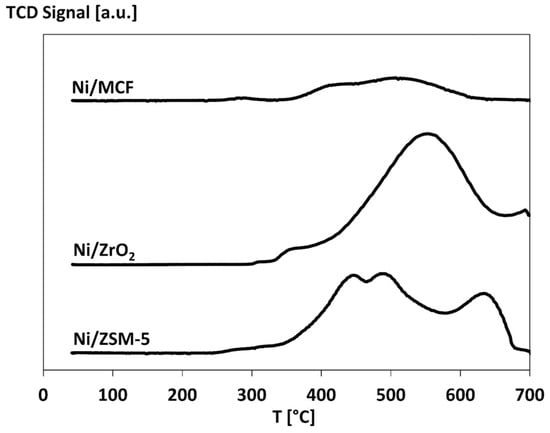 TPR experiments revealed that the interactions between an active phase and the support in the case of the most active Ni/MCF catalyst are moderate. Weak interactions may result in sintering of nickel crystallites, while too-strong interactions may lead to the difficulty of nickel oxide reduction during the reaction and overall changes in the properties of the catalyst [52].