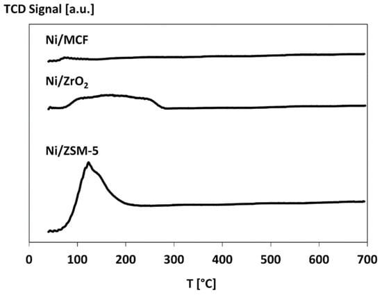The results of temperature-programmed desorption (TPD)-NH3 measurements (Table 3) reveal that Ni/ZSM-5 catalyst possesses considerably higher surface acidity (905 mmol/NH3/g) than other samples (187 and 56 mmol/NH3/g for Ni/ZrO2 and Ni/MCF, respectively). TPD profiles for ammonia (Figure 4) demonstrate that desorption of ammonia generally occurs at temperatures not higher than 300 °C. However, in the case of the most acidic Ni/ZSM-5 catalyst, this process was observed only between 80 °C and 200 °C. High acidity of catalysts supported on ZSM-5 in comparison to MCF [41] and ZrO2 [16] has been previously observed in Reference [42].