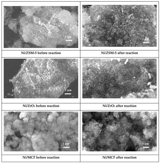 SEM images collected from the surface of the catalysts demonstrated differences in their morphology. In the case of the Ni/ZrO2 sample, large crystallites of support with the most compact structure were observed. On the other hand, for Ni/ZSM-5 and Ni/MCF catalysts, agglomerates of support microcrystallites were noted. Their size was the smallest for the system containing MCF. This observation is in agreement with the results of surface area presented in Table 3 and literature reports [32].