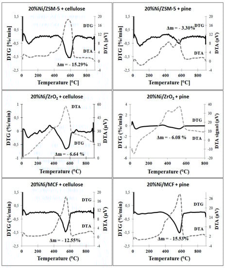 Thermogravimetric experiments were conducted in order to evaluate the amount and reactivity of carbon deposited on the surface of the catalysts. The experiments were performed for the samples used in both cellulose and pine decomposition. Quantitative analysis of TG curves (Table 5) revealed that in the case of cellulose conversion, the highest amount of deposited carbon was observed for Ni/ZSM-5 and Ni/MCF catalysts (15.3 and 12.5 wt.%, respectively), while in the case of Ni/ZrO2, carbon deposition was about two times lower (6.6 wt.%). A different trend was observed in the case of pine decomposition. In this case, the amount of carbon on the surface of Ni/MCF and Ni/ZrO2 remained at a high and moderate levels, respectively (15.5 and 6.1 wt.%). However, the carbon content obtained on Ni/ZSM-5 was considerably lower (3.3 wt.%). This phenomenon is related with the fastest drop in the activity of the Ni/ZSM-5 in the presence of lignin, which will be discussed later.