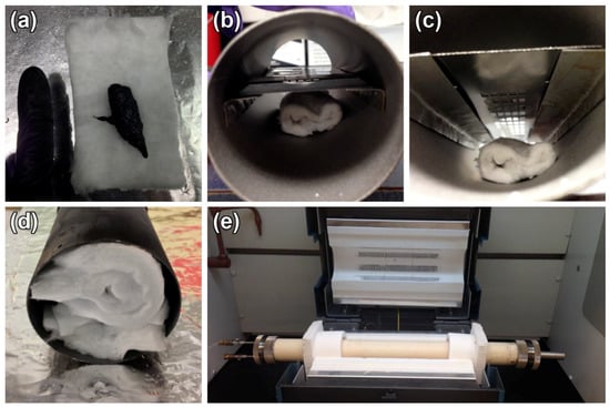 Graphite from the University of Idaho thermolyzed asphalt reaction (GUITAR) deposition experimental setup. (a) Five grams of asphalt on an alumina blanket; (b) alumina blanket with asphalt placed below a NS sample inside a cylindrical steel tube; (c) NS-coated surface faces down toward an alumina blanket; (d) endcaps of the cylindrical steel tube capped with the alumina blanket; (e) tube furnace with the N2 inlet on the left and open exhaust on the right.