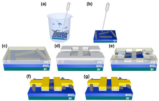 Schematic representation of the device fabrication process. (a) GUITAR-coated nanosprings (G-NSs) released into IPA and (b) drop-cast onto a SiO2/Si substrate. (c) Photoresist (PR) is spun onto the substrate. (d) UV light is exposed to photoresist with a chrome mask in place to create the electrode pattern. (e) The photoresist exposed to UV is removed with a developer. (f) Ti and Au are deposited via thermal evaporation and the remaining photoresist is removed in a solution of photoresist remover. (g) The electrode gap is cleared of G-NSs via a micromanipulator until one G-NS remains with sufficient contact.