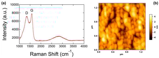 Figure 3a shows a Raman spectrum with a 532 nm excitation source of a GUITAR coating on a silicon substrate. Figure 3b shows the corresponding AFM image of the surface of GUITAR on a silicon substrate. The surface is an agglomeration of carbon spheroids ~50 nm in diameter. A discussion of the surface morphology is presented in the following section. The Raman spectrum in Figure 3a consists of two prominent peaks located at 1347 cm−1 and 1589 cm−1, as well as a broad peak centered at ~2800 cm−1. The peak at 1589 cm−1, also known as the G peak, is attributed to a phonon with E2g symmetry and is associated with in-plane bond stretching of pairs of sp2 hybridized carbon atoms [21,32]. The wavenumber of the G peak falls in the range of 1500–1630 cm−1 and does not require the presence of six-fold rings, i.e., it is present for all sp2 bonding [32]. The peak located at 1347 cm−1, commonly denoted as the D peak, originates from a phonon with A1g symmetry [21]. The D peak, in conjunction with the G peak, is only observed in the presence of disorder and is not present in the Raman spectra of ideal graphite [21,32]. A small, yet notable, feature is present on the shoulder of the D peak at ~1150 cm−1. This peak is commonly used to characterize nanocrystalline diamond and attributed to sp3 bonding [33,34,35,36]. However, Ferrari et al. argue that this peak must originate from an alternate chain of sp2 carbon atoms formed by a single hydrogen bonded to each C [37]. A previous study of GUITAR using XPS showed that the material could possibly contain alternate chains of sp2-bonded carbon atoms, such as C=N, which could account for the peak at ~1150 cm−1 [1].