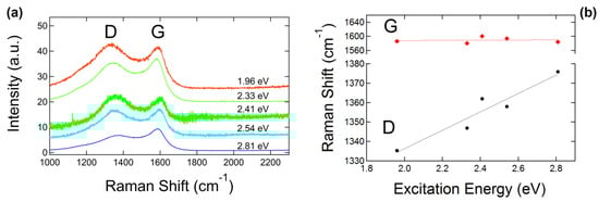 - Matthews, M.J.; Pimenta, M.A.; Dresselhaus, G.; Dresselhaus, M.S.; Endo, M. Origin of dispersive effects of the Raman D band in carbon materials. Phys. Rev. B 1999, 59, R6585. [Google Scholar] [CrossRef]