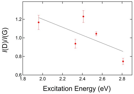 The excitation energy dependence of GUITAR’s Raman spectrum provides further evidence that GUITAR corresponds to Stage (2) carbon formation. Figure 4a shows the Raman spectra of GUITAR with 1.96 eV (633 nm), 2.33 eV (532 nm), 2.41 eV (514 nm), 2.54 eV (488 nm), and 2.81 eV (442 nm) excitation energies (wavelengths). The Raman spectrum for each excitation energy was fitted with a Lorentzian line shape for the D peak and a Breit–Wigner–Fano (BWF) line shape for the G peak. The BWF line shape function is as Equation (1),