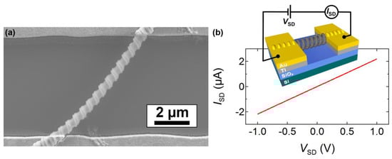 Figure 7a shows an SEM image of a typical single G-NS device spanning a ~6 µm gap between two Ti/Au source-drain electrodes. Figure 7b shows a typical two-point probe source–drain current–voltage (ISD–VSD) curve for a single G-NS device at room temperature and atmospheric pressure. The inset in Figure 7b shows a three-dimensional schematic and electrical diagram of the single G-NS device. The ISD–VSD curve is linear and indicative of Ohmic contacts. All of the devices tested in this work displayed Ohmic behavior. The total resistance () obtained from the two-point ISD–VSD measurement is the sum of the resistance of the single G-NS () and of the two contact resistances ( at the GUITAR–Ti/Au interface on each end: . Previous studies on the contact resistance of single- and multilayered graphene to Ti/Au metal contacts have reported contact resistances of <250 Ω for multilayered graphene (~50 layers) [51], and ~165 Ω for single-layered graphene [52]. A comparison of the contact resistances for Ni contacts on graphene and highly ordered pyrolytic graphite (HOPG) has shown that the measurements are approximately two orders of magnitude higher for Ni contacts on graphene than on HOPG. This greater contact resistance is attributed to the higher charge density in HOPG [51]. Additionally, Venugopal et al. have shown that the contact resistance for metal contacts on multilayered graphene decreases as the number of graphene layers increases [51]; this is because increasing the number of graphene layers results in increased carrier concentration, until the structure approaches that of HOPG, i.e., becomes more metallic. Since the GUITAR coating is characteristic of a disordered multilayered graphitic material, it must have a high charge density, representative of multilayered graphene and HOPG. Therefore, the contact resistance of the GUITAR–Ti/Au is small (<250 Ω), or ~3 orders of magnitude smaller than the total resistance of a single G-NS (~500 kΩ), and therefore can be neglected.