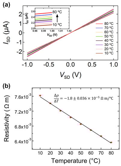 The temperature-dependent ISD–VSD curves of a single G-NS (device 3) from 10–80 °C in increments of 10 °C are displayed in Figure 8a. The inset in Figure 8a shows the upper range of the ISD–VSD plot and the device’s linear change in resistance as a function of temperature. Note that the ISD–VSD curve remains Ohmic across the entire temperature range. The slopes of five ISD–VSD curves were used to calculate the average resistivity at each temperature, which are presented in Figure 8b. The vertical errors bars are smaller than the markers used in the plot. The resistivity of the device is linear with respect to temperature and decreases at ~ −1.8 × 10−5 Ω m/°C, i.e., has a negative slope.