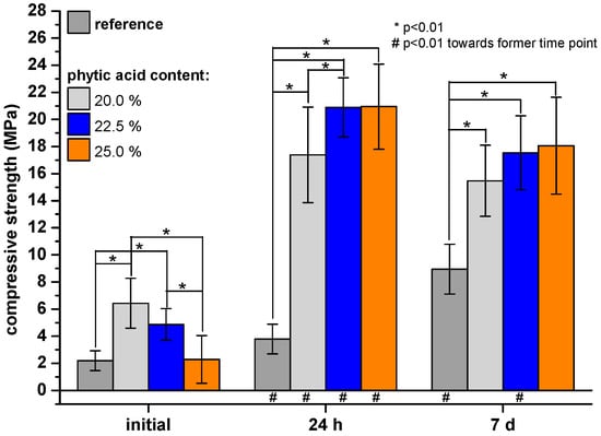 We determined the intrinsic material strength via a compressive strength test setup (Figure 1). Obviously, the phytic acid containing samples had a significant higher compressive strength at every measured time point compared to the reference. Only those samples with a 25.0% phytic acid amount had an initial strength after 1 h setting of 2.29 ± 1.76 MPa which was comparable to the reference strength (2.21 ± 1.76 MPa). In the course of 7 d, the reference compressive strength increased by 305% up to 8.95 ± 1.84 MPa, while the phytic acid modified cements had strengths in the range 16–18 MPa.