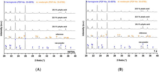 Corresponding XRD patterns initially (A) respectively after 7 d (B) hardening of the cement prepared at a powder-to-liquid ratio of 2.0 g/mL. Characteristic reflexes are marked with f (farringtonite, PDF-No. 33-0876) respectively n (newberyite, PDF-No. 35-0780) in comparison to JCPDS references.