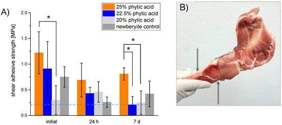 Figure 3 reveals the corresponding adhesive strength of various cement formulations on bovine bone. The blue dotted line marks a strength of 0.2 MPa which was determined 1984 by Weber and Chapman [27] to be a threshold value for bone-bonding agents. Adhesives with a lower strength would not be feasible during surgery [27]. Initially, all samples showed an appropriate adhesiveness on bone between 0.75 ± 0.20 (reference) to 1.22 ± 0.41 MPa (25.0%). Samples with the lowest phytic acid content represented an exception, as their adhesiveness laid underneath the as-mentioned threshold value. After ageing, only the composition with a 25.0% phytic acid amount had an appropriate adhesiveness of 0.81 ± 0.12 MPa still after 7 d. With this composition, it was possible to fix a manually broken porcine cadaver mandible such that after 10 min the bonding slit withstood the weight of the heavier part as demonstrated in Figure 3B.