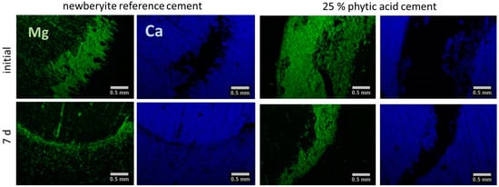 Examples of EDS element maps of cement adhesives made from farringtonite and either 2.0 M phosphoric acid (reference) or 25.0% phytic acid initially or after 7 d hardening in PBS at 37 °C on ground bovine bone samples. All cements were prepared in a powder-to-liquid ratio of 2.0 g/mL. The pictures show the Mg (green, cement residues) respectively Ca (blue, bone) map dispersion solely.