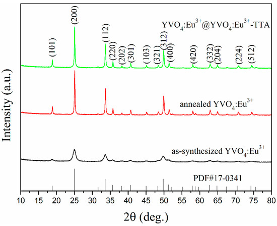 Figure 2 shows the X-ray diffraction (XRD, Bruker D8 Focus) patterns of the as-synthesized YVO4:Eu3+, the annealed YVO4:Eu3+ and the YVO4:Eu3+@YVO4:Eu3+–TTA hybrid nanoparticles. All of the diffraction peaks of samples are identical to the JCPDS 17-0341 of the tetragonal YVO4, and no impurity phases were present. The strong and narrow XRD peaks of the annealed YVO4:Eu3+ nanoparticles in Figure 2 suggested that the annealing process greatly enhanced their crystallization. It is also noted in Figure 2 that, after the core-shell process and hybridization with TTA, the YVO4:Eu3+ nanoparticles still had the same XRD patterns.