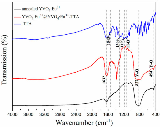 The Fourier transform infrared (FTIR, Nicolet 380) spectra of TTA, the annealed YVO4:Eu3+ and YVO4:Eu3+@YVO4:Eu3+–TTA hybrid nanoparticles are shown in Figure 4. The strong absorption band located at 1638 cm−1 is both from the H–O–H bending vibration of adsorbed water [24] and the ketonic group and thiophene of TTA [25]. Four new peaks at 1543 cm−1, 1309 cm−1, 1193 cm−1, and 1143 cm−1 for the YVO4:Eu3+@YVO4:Eu3+–TTA hybrid nanoparticles are attributed to the characteristic peaks of TTA [26]. This indicates that TTA successfully hybridized with the YVO4:Eu3+@YVO4:Eu3+ nanoparticles. The strong absorption peak at 827 cm−1 is due to the absorption of V–O bonds [27], while the weak peak at 454 cm−1 is due to the absorption of Y(Eu)-O bonds [28,29].