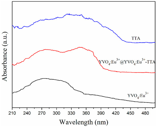 The UV–Vis (TU-1950) absorption spectra of the annealed YVO4:Eu3+ nanoparticles, TTA, and YVO4:Eu3+@YVO4:Eu3+–TTA hybrid nanoparticles are shown in Figure 5. The broad absorption band (230–330 nm) of the annealed YVO4:Eu3+ nanoparticles was due to the VO43- groups in the host lattice of YVO4 nanoparticle [30]. It also can be seen in Figure 5 that TTA had a broad absorption band of 240–420 nm. Consequently, YVO4:Eu3+@YVO4:Eu3+–TTA nanoparticles possessed two broad absorption bands in the ultraviolet range, which is due to the presence of VO43− groups and TTA ligands.