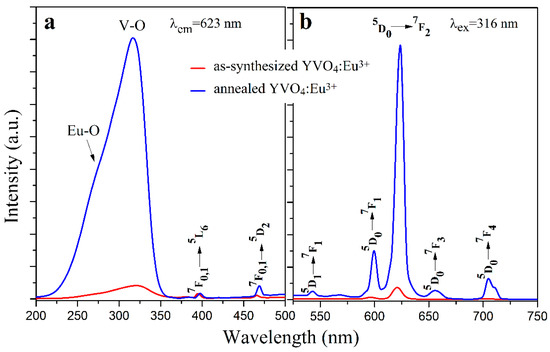 The excitation (a) and emission (b) spectra of the as-synthesized (unannealed) and the annealed YVO4:Eu3+ nanoparticles.
