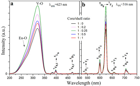 Figure 7 shows the photoluminescence excitation and emission spectra of the YVO4:Eu3+@YVO4 core–shell nanoparticles having different core/shell ratios. Such a homo-nanoparticled shell is believed to be able to effectively passivate the non-radiative traps or defects on the surface of the core [19,20]. The photoluminescence spectra in Figure 7 are typical for the Eu3+-doped YVO4 phosphors. After the core-shell process, the YVO4:Eu3+@YVO4 nanoparticles had stronger photoluminescence than the unshelled YVO4:Eu3+ nanoparticles (core/shell ratio = 1:0 in Figure 7), indicating the passivation effect of the YVO4 shell. The YVO4:Eu3+@YVO4 core–shell nanoparticles with the core/shell ratio of 1:0.25 had the highest photoluminescence property (Figure 7).
