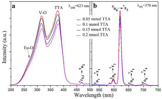 Figure 8 shows the photoluminescence spectra of the YVO4:Eu3+@YVO4:Eu3+–TTA inorganic–organic hybrid nanoparticles with different TTA amounts. Figure 9 compares the photoluminescence spectra of the YVO4:Eu3+@YVO4:Eu3+ nanoparticles and the YVO4:Eu3+@YVO4:Eu3+–TTA inorganic–organic hybrid nanoparticles. Compared with the excitation spectra of the as-synthesized and the annealed YVO4:Eu3+ nanoparticles (Figure 6a), the YVO4:Eu3+@YVO4:Eu3+–TTA inorganic–organic hybrid nanoparticles had a new excitation peak at about 378 nm (Figure 8a), which is a result of the TTA ligands. Consequently, the excitation spectral bandwidth of YVO4:Eu3+ was notably broadened from the range of 230–330 nm (Figure 6a) to the range of 230–415 nm (Figure 8a).