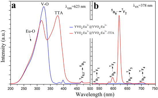 Comparison of the photoluminescence excitation (a) and emission (b) spectra of the YVO4:Eu3+@YVO4:Eu3+ nanoparticles and the YVO4:Eu3+@YVO4:Eu3+–TTA inorganic–organic hybrid nanoparticles.