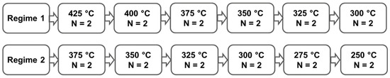6. Then, cast ingots with a diameter of 60 mm underwent a T4 heat treatment (annealing at 450 °C for 8 h on Mg-2Ag and 16 h on Mg-4Ag followed by cooling by quenching in water). To obtain billets 10 mm in diameter required for further ECAP, the ingots of the alloys were extruded at a temperature of 425 °C with an extrusion ratio of 1:25 and a ram speed of 2.2 mm/s. The resulting condition will be referred to as the initial state of the alloys. Route Bc ECAP was carried out according to two different schedules, with temperature being dropped in discrete steps after defined strain increments (
