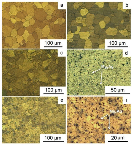Figure 2e). The greater refinement of the Mg-4.0%Ag alloy structure, unlike the Mg-2.0%Ag alloy, is probably due to the large amount of silver in the composition. An increase in its content leads to a certain shift in the beginning and end of the recovery processes towards higher temperatures, which gives rise to a more significant grain refinement. The second regimes of ECAP leads to the refinement of the Mg-4.0%Ag alloy structure from 41.2 ± 3.8 μm to 2.8 ± 1.3 μm and precipitation of particles of the Mg