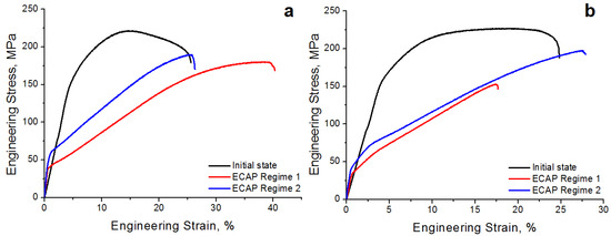 Figure 4a). As a result, the strength of the alloy drops relative to the initial state and its ductility nearly doubles, the tensile elongation rising from 17.2% to 34%. After regime 2 ECAP, the activity of prismatic slip increases, whereas that of basal slip declines. However, the texture corresponding to inclined basal slip is still detectable in the pole figures (
