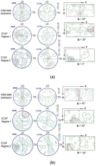 Figure 4b). The increased activity of the basal slip and the prismatic slip after ECAP of these alloys leads to enhanced ductility of these materials. In this case, one should remember that in all the pole figures {00.4} a tilted basal texture with a deflection angle of 50°–80° was found, which can cause a negative effect of ECAP on the strength characteristics. We observed this situation when studying the mechanical properties. Under both regimes tested, ECAP softened both alloys, despite a decrease in the average grain size. It should also be noted that the observed texture changes contribute to easy slip of dislocations during deformation.