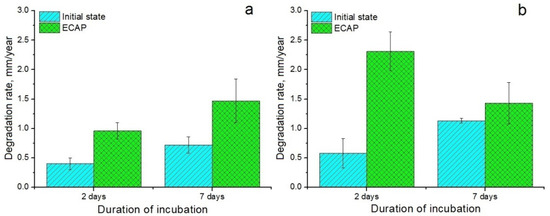 Figure 5 that ECAP leads to an increase in the biodegradation rate of both alloys as reflected in magnitude of the mass loss. In the case of Mg-2.0%Ag the increase in the degradation rate was not as substantial as in that of Mg-4.0%Ag. After two days of incubation, the degradation rate of the Mg-2.0%Ag alloy in the initial and ECAP-processed conditions was at a level of 0.40 ± 0.10 and 0.96 ± 0.14 mm/year, respectively. A longer incubation time (seven days), in general, did not change this tendency, although the degradation rate for both states of the alloy (0.72 ± 0.14 and 1.47 ± 0.37 mm/year, respectively) was more rapid. The situation was somewhat different in the case of the Mg-4.0%Ag alloy. After two days of incubation, the degradation rate of the alloy was increased by ECAP quite appreciably, from 0.58 ± 0.25 mm/year in the initial state to 2.31 ± 0.33 mm/year in the ECAP-modified condition. Incubation for seven days led to an increase in the degradation rate of the alloy in the initial state (to 1.13 ± 0.04 mm/year), while the degradation rate of the ECAP-processed alloy dropped substantially (to 1.43 ± 0.35 mm/year).