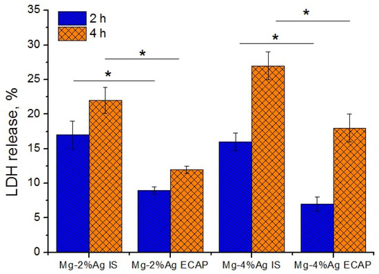The cytotoxic effect of Mg-2.0%Ag (n = 3) and Mg-4.0%Ag (n = 3) alloys was assessed by studying the induction of lactate dehydrogenase (LDH) by cells in the culture medium after 2 h and 4 h of co-incubation. For this purpose, the cells in the wells with the samples and in the control were gently mixed by pipetting, then 100 μL of cell suspension were collected and centrifuged at 300 g. After that, 50 μL of the supernatant were collected. The measurements and analysis of the results were performed using the Pierce LDH Cytotoxicity Assay Kit (Thermo Fisher Scientific, USA) in accordance with the manufacturer’s instructions. Optical density was measured on an MS Multiscan plate reader (Labsystems, Thermo Fisher) using a 492 nm filter against 690 nm.