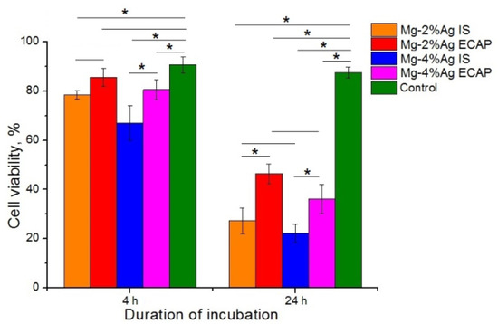 It was established with statistical confidence that the samples of the alloys in the initial state inhibited the viability of tumor cells more efficiently than ECAP-processed ones. Samples containing 4% Ag were found to be more toxic to tumor cells. The data obtained showed that both investigated alloys inhibited the viability of tumor cells already after 4 h of co-incubation. The smallest effect was exhibited by the Mg-2.0%Ag alloy processed by ECAP (regime 2). This type of samples inhibited the viability of tumor cells by only 5% (p > 0.05), while all other samples had a more pronounced, statistically significant effect: 12% for Mg-2.0%Ag in the initial state, 23% for Mg-4.0%Ag in the initial state and 10% for Mg-4.0%Ag after ECAP (calculated from the average values). This effect was even more pronounced after 24 h of co-incubation: 60% for Mg-2.0%Ag in the initial state, 41% for Mg-2.0%Ag after ECAP, 65% for Mg-4.0%Ag in the initial state and 52% for Mg-4.0%Ag after ECAP (calculated from the average values).