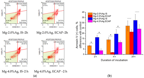 Figure 8). It was found that incubation with alloy samples contributed to an increase in the concentration of Annexin V (+) cells, which may indicate an increase in the level of apoptosis in culture. Significant differences between the effectiveness of exposure to alloys in the initial state and the ECAP-processed one during the first days of incubation were observed—the activity of the former was markedly higher. This trend was also noticeable after 24 h but this was not statistically confirmed. Samples containing 4% Ag were more active than those with the corresponding processing history but a lower concentration of silver.