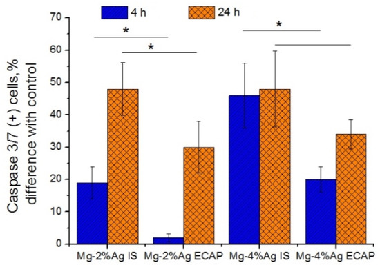 Figure 9). The samples in the initial state showed a greater effect than those in the ECAP-processed condition. After four hours of incubation, the effect of the leaner alloy, Mg-2.0%Ag, after ECAP did not differ significantly from the control, while contact with the other samples raised the number of Caspase 3/7 (+) cells in culture compared to the control—by 19% for Mg-2.0%Ag alloy in the initial state—by 46% for Mg-4.0%Ag alloy in the initial state and for Mg-4.0%Ag after ECAP in terms of the average values. The number of Caspase 3/7 (+) cells in the culture with alloy samples continued to grow with the incubation time—after 24 h the increment caused by the influence of the Mg-2.0%Ag alloy in the initial state amounted to 48% and of that after ECAP to 30% relative to the control. The corresponding values for alloy Mg-4.0%Ag were 48% and 34%.