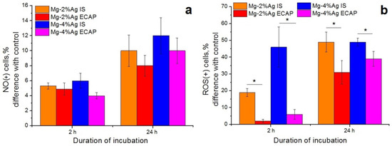 39]. Our study showed a significant increase in the level of ROS in the culture of tumor cells caused by incubation with the tested Mg-Ag alloys. Furthermore, it was demonstrated that in the initial state these alloys had a greater effect on this process than their ECAP-treated counterparts. Thus, after four hours of incubation with the Mg-2.0%Ag alloy in the initial state, the concentration of ROS(+) tumor cells was 6.3 times higher than after the same time of incubation with the same alloy but processed by ECAP. After 24 h of incubation this ratio was 1.6. The effectiveness of the Mg-4.0%Ag alloy in the initial state exceeded that of the ECAP-processed alloy by a factor of 9 and 1.3 after 4 and 24 h of incubation, respectively. A decrease of the difference in the efficacy of samples with different structures with the incubation time can be explained by depletion of the cells redox potential and the reactivity of cells due to membrane destruction or by their programmed death, since most cells were already at some stage of apoptosis. Apoptosis most likely occurred due to the activation of redox-sensitive MAP-kinases. In the course of this study we found that, although the tested alloys increased the production of NO ions by cells, the release of these ions was not the main factor governing the intensity of the induced oxidative stress in tumor cells. This conclusion is also supported by the absence of noticeable differences in the concentration of NO(+) cells incubated with the tested alloys in both structural conditions (initial and ECAP-treated ones). There are therefore reasons to believe that the stimulation of the redox potential of cells by the tested alloys involves production of other aggressive oxygen ions. It is known that H