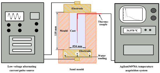- Li, J.; Ma, J.; Gao, Y.; Zhai, Q. Research on solidification structure refinement of pure aluminum by electric current pulse with parallel electrodes. Mater. Sci. Eng. A 2008, 490, 452–456. [Google Scholar] [CrossRef]