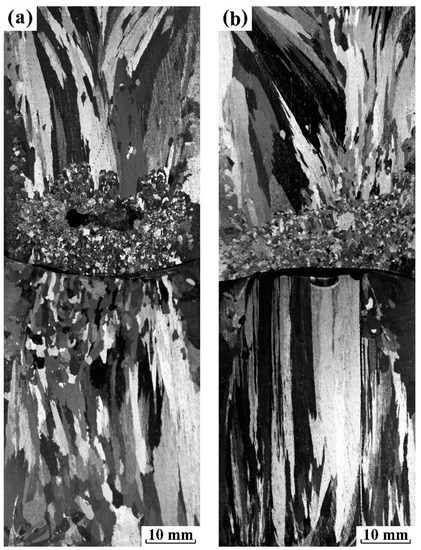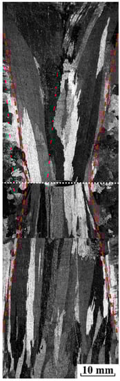 The as-cast macrostructure of pure aluminum ingot along the longitudinal section without electropulsing is shown in Figure 2. Note that the heat flux is proportional to the metal/mold heat transfer coefficient in the casting process. Since the heat transfer coefficient between the casting surface and the copper surface at the top and bottom of the mold (~103 W·m−2·K−1 [30]) at 933 K far exceeds that between the casting surface and sand mold surface (~102 W·m−2·K−1 [31]), the heat is extracted mainly through the top and bottom copper electrode. As a result, the upward and downward vertical columnar grains expand over most of the ingot, and intersect at the center of ingot indicated by a dotted horizontal white line. In addition, little columnar grains grow radially towards the center of ingot, and exhibit a gradual increase in the length of the columnar grains from two ends of cylindrical mold to the axial center.