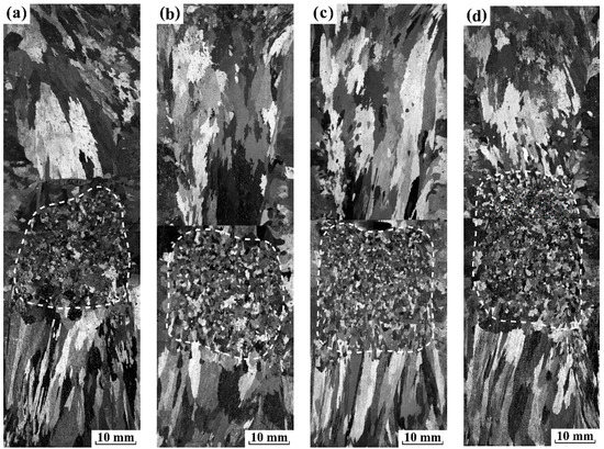 The sequence of macrographs in Figure 3 and Figure 4 displays, under electropulsing with 480 and 900 A, respectively, how the grain macrostructure of pure aluminum changes as a result of gradually increasing the preheating temperature of sand mold. One dotted white curve is superimposed on the macrographs to indicate the FEG zone.