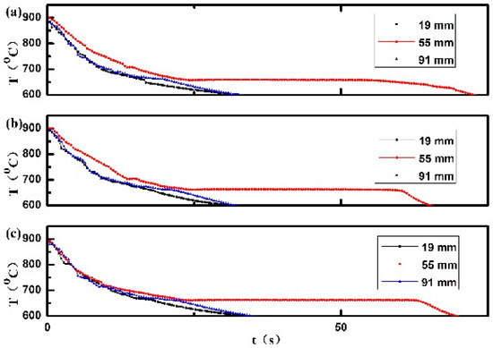 Cooling curves measured during solidification of pure aluminum: (a) without electropulsing; (b) under an alternating electropulsing with 480 A and 50 Hz and (c) under an alternating electropulsing with 900 A and 50 Hz.