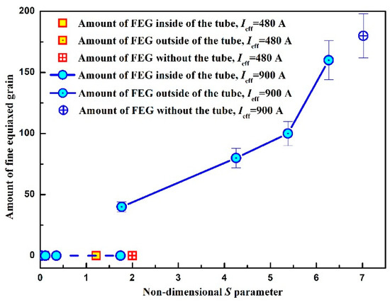 As discussed above, the formation of FEG should attribute to competition and cooperation between ΔGem and the forced melt flow. To clarify this speculation, the amount of FEG in different regions of mold embedded stainless mesh below the mesh plate N was measured with respect to the different melt flow. Figure 9 represents the variation in N as a function of non-dimensional S parameter, which was calculated based on Equation (3). Here, the value ν = 1.25 mPa·s [42] and ρ = 2.35 g·cm−3 [43] were employed. It can be seen that N gradually increased with the S parameter outside the tube under the same electropulsing of 99.2 A·cm−2, and there was no the formation of FEG inside the tube in the present experiments. When the calculated S parameter was approximately 1.77 FEG occurred outside the tube. In contrast, there was no the formation of FEG beyond this value under electropulsing of 52.9 A·cm−2. Since the driving force ΔGem was proportional to current density, ΔGem under electropulsing of 52.9 A·cm−2 was probably insufficient to drive the dissociation of heterogeneous crystal nuclei at the lateral wall (Figure 7b). Meanwhile, the present melt flow had little effect on the formation of FEG. This speculation explains the experimental data under electropulsing of 52.9 A·cm−2 very well. It is noted that even if the intensity of forced convection was much smaller than in the preceding case, FEG still appeared near the mold wall under electropulsing of 99.2 A·cm−2 (Figure 8e). This indicates that the higher driving force ΔGem gave rise to the dissociation of crystal nuclei on the side wall, leading to the generation of FEG. For a further increase in the intensity of the melt flow (Figure 8a–d) the additional FEG arising from the dissociation of crystal nuclei on the side wall was induced by the stronger convection.