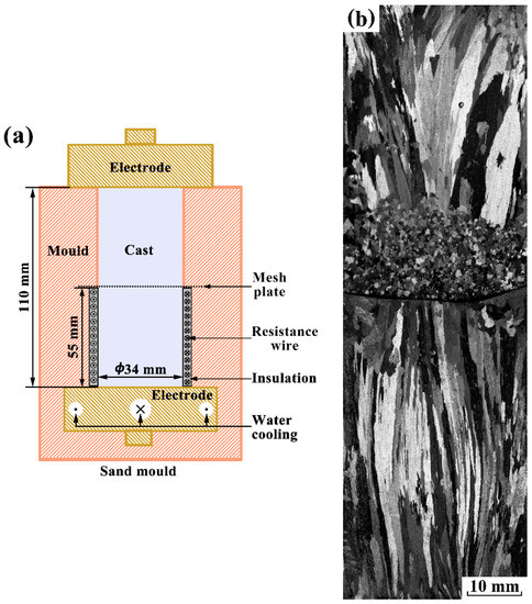 As described in the introduction, the strong forced flow can induce dendrite fragmentation, leading to the formation of FEG [20,21]. However, the present analysis cannot identify whether dendrite fragmentation is distinctly induced by the application of electropulsing with 900 A. In order to explain it, a casting experiment with an improved mold was designed. As shown in Figure 10a, the mold was separated into two parts by a horizontally placed mesh: the sand mold with 34 mm in diameter and 55 mm in height above the mesh, the ceramic mold with 34 mm in internal diameter, 55 mm in height and a 3 mm in thickness below the mesh. The outer surface of the ceramic mold was twined by heated Cr20Ni80 resistance wire to prevent the radial heat flux through the mold. Here, the temperature of the side wall was preheated to 933 K, both the solidification condition and the applied electropulsing parameters were same as those of experiment 4 (a). The longitudinal as-cast macrostructure of pure aluminum ingots using an improved mold is displayed in Figure 10b. As a result, a significant fine equiaxed zone appears in the front of vertical downward columnar grains above the mesh plate. However, the coarse columnar grains take up the entire ceramic mold. Below the mesh plate, crystal nuclei appeared at the bottom electrode and developed into columnar structure during the solidification process. If FEG generates in this case, its dominant origin should be dendrite fragmentation caused by the melt flow. From macrostructural observation, it could confirm that the application of electropulsing with 900 A could not lead to the significant fragmentation of columnar grains.