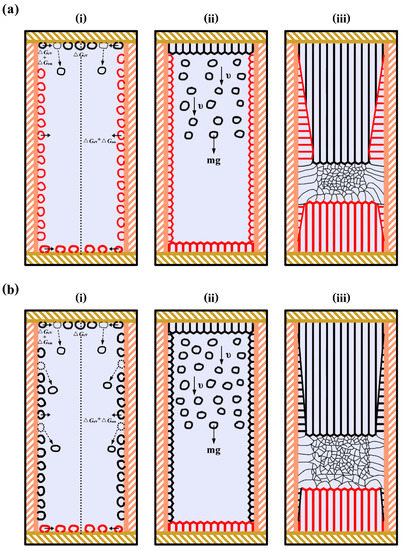 From these findings, the following scenario was considered for the formation process of FEG during solidification of pure aluminum with the application of present electropulsing, as schematically illustrated in Figure 11. Under electropulsing with 480 A, heterogeneous nuclei firstly appeared on the side wall and the interface of the electrodes and the melt. The applied electropulsing made heterogeneous nuclei fall off from the upper interface until the solidification shell forms due to ΔGem, as shown in Figure 11ai. Then, the dissociated crystal nuclei moved towards the bottom of the mold due to its gravity and the grains in the solidification shell, which could grow parallel and opposite to the heat flow direction, would develop into a columnar structure (Figure 11aii). Subsequent, columnar-to-equiaxed transition occurred, if the number and size of the equiaxed grains ahead of the upward and downward columnar grain front accumulated to their limit, i.e., the columnar growth was blocked and an equiaxed zone formed, as shown in Figure 11aiii. Similar results have been reported in earlier studies [44,45]. The formation process of FEG under electropulsing with 900 A is schematically illustrated in Figure 11bi–iii. Compared with the proposed process under electropulsing with 480 A, the main distinction was that FEG grew from the dissociated crystal nuclei, which resulted from the lateral wall and the upper interface of the electrode and the melt due to ΔGem and the forced convection under electropulsing with 900 A, as shown in Figure 11bi.