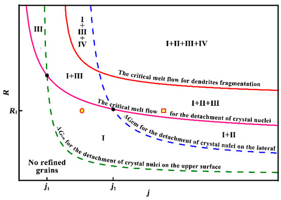 It is noted that the scenario of the FEG formation process proposed here essentially relied on ΔGem and the forced melt flow. As described in the introduction, previous studies [5,20,21] demonstrated that dendrite fragmentation induced by the strong forced convection was one of the main origins of FEG. Therefore, the mechanism of grain refinement considered comprehensively factors in terms of the dissociation of crystal nuclei due to ΔGem, and the dissociation of crystal nuclei and dendrite fragmentation due to the forced melt flow. Figure 12 shows the schematic summary of the origin of FEG in pure aluminum under electropulsing. j and R were the main variables that determined the origin of FEG in a normal casting. The dash curves represent a constancy of the origin of FEG induced by ΔGem (no effect, the dissociation of crystal nuclei on the upper interface, and on the side wall). Additionally, the various values (solid curves running from upper left to lower right) represent a constancy of the origin of FEG induced by the forced melt flow (no effect, the dissociation of crystal nuclei and dendrites fragmentation). The different regions segmented by curves correspond to the different origins of FEG. Thus, the role of ΔGem and the forced melt flow on the origin of FEG in pure aluminum under electropulsing could be determined. The circle and square symbol were superimposed on the graph to indicate the origin of FEG under electropulsing of 52.9 and 99.2 A·cm−2, respectively.