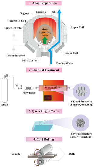 Step-by-step procedure for preparation of Ni- treated Ti: (1) The cold crucible levitation melting technique (CCLM) through which an alloy with a uniform composition is formed by an electromagnetic force. Using this method, metals with a high melting point are melted with no contamination, (2) Tube furnace in which the obtained alloy is homogenized at high temperature under high-purity argon atmosphere, (3) The specimens are quenched to achieve the favorable crystal phase, and (4) Cold rolling with the aim of achieving the favorable sample thickness (source: authors).