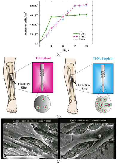 (a) Cell viability of fibroblasts under three culture conditions: culture on plastic control sample, Grade 2 Titanium alloy (Ti40), and titanium–niobium alloy (Ti-Nb), (b) Ti-Nb implant exhibits proper cell proliferation compared to the Ti implant, (c) SEM images of (A) cells grown on Ti40, G = 2050×; (B) cells grown on Ti-Nb, G = 1400×; image indicates the cell adhesion to the surface.