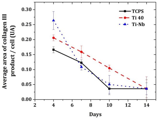 Production of type III collagen by fibroblasts under three culture conditions: culture on TCPS, Ti40, and TiNb.