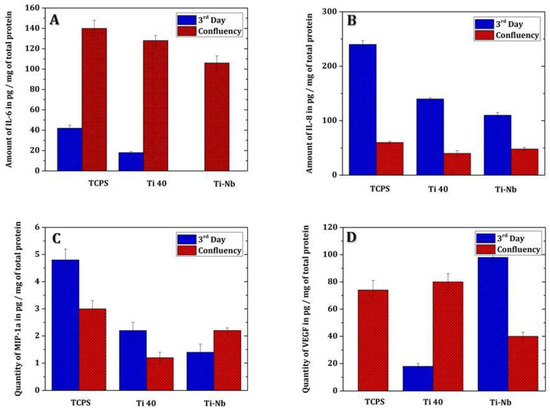 The absence of type I collagen could be explained by the fact that during the healing process, type III collagen, which contributes to tissue elasticity, is first synthesized and then replaced by type I collagen, which is responsible for preserving the tissue’s shape. The IL-6 assay was performed on the third day and at confluency (i.e., seventh day for fibroblasts grown on TCPS and 14th day for those grown on Ti-40 and Ti-Nb), as shown in Figure 4A. It should be noted that IL-1β, IL-10, and TNF-α were not detected. Regarding the IL-6 assay, the general pattern was an increase in the amount of IL-6. Indeed, for fibroblasts grown on TCPS, the amount of secreted IL-6 increased from 45.9 µg/mg protein ± 7.3 to 140 µg/mg protein ± 12.3. For fibroblasts cultured on Ti-40, the amount of secreted IL-6 increased from 18.36 µg/mg protein to 129.8 µg/mg protein ± 0.8. Finally, for fibroblasts cultured on TiNb, the amount of IL-6 increased from 0 µg/mg protein to 108 µg/mg protein ± 11 (Figure 4A). Regarding the IL-8 assay, the general pattern was a decrease in the amount of IL-8. For fibroblasts cultured on TCPS, the amount was increased from 235.4 µg/mg protein ± 25 to 66.5 µg/mg protein ± 12. For fibroblasts grown on Ti-40, the amount was increased from 137.8 µg mg/kg protein ± 38 to 38 µg/mg protein ± 14, and for fibroblasts grown on Ti-Nb, the amount was increased from 111 µg/mg protein ± 6 to 47 µg/mg protein ± 29 (Figure 4B). The macrophage inflammatory proteins (MIP-1α) assay showed a relatively stable secretion by fibroblasts over time. The amount secreted by fibroblasts grown on TCPS increased from 5 µg/mg protein ± 3 to 3 µg/mg protein. The amount secreted by fibroblasts grown on Ti-40 had increased from 2.32 µg/mg protein ± 0.4 to 1.28 µg/mg protein. Furthermore, the amount secreted by fibroblasts grown on Ti-Nb had increased from 1.45 µg/mg protein to 2.20 µg/mg protein ± 0.25 (Figure 4C). The VEGF assay showed an increase in the secretion of it by the fibroblasts. The amount secreted by fibroblasts grown on TCPS had increased from 0 µg/mg protein to 72 µg/mg protein. The amount secreted by fibroblasts grown on Ti-40 had increased from 15.15 µg/mg protein to 80.2 µg/mg protein ± 12. Finally, the amount secreted by fibroblasts grown on Ti-Nb had increased from 39.25 µg/mg protein ± 5 at 98.5 µg/mg protein (Figure 4D).