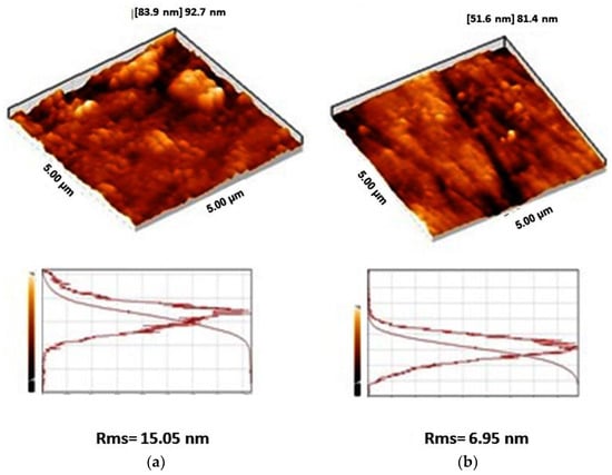 The surface morphology and surface roughness of Ti-40 and Ti-Nb samples are compared based on AFM images (Figure 6). AFM images of the samples show a lower grain size for the Ti-Nb alloy (~30 nm) compared to the Ti-40 alloy (about 60 nm). It has been shown that the addition of elements during the formation of an alloy suppresses its grain growth via the formation of thermally stable second phases at the grain boundaries of the host metal phase [32,33]. Moreover, the quantitative analysis of surface roughness of the samples due to AFM images shows a lower root mean square (rms) roughness of Ti-Nb compared to that of Ti-40. It has been previously proved that in aluminum and stainless steel alloys, a larger grain size results in higher roughness values [34,35].